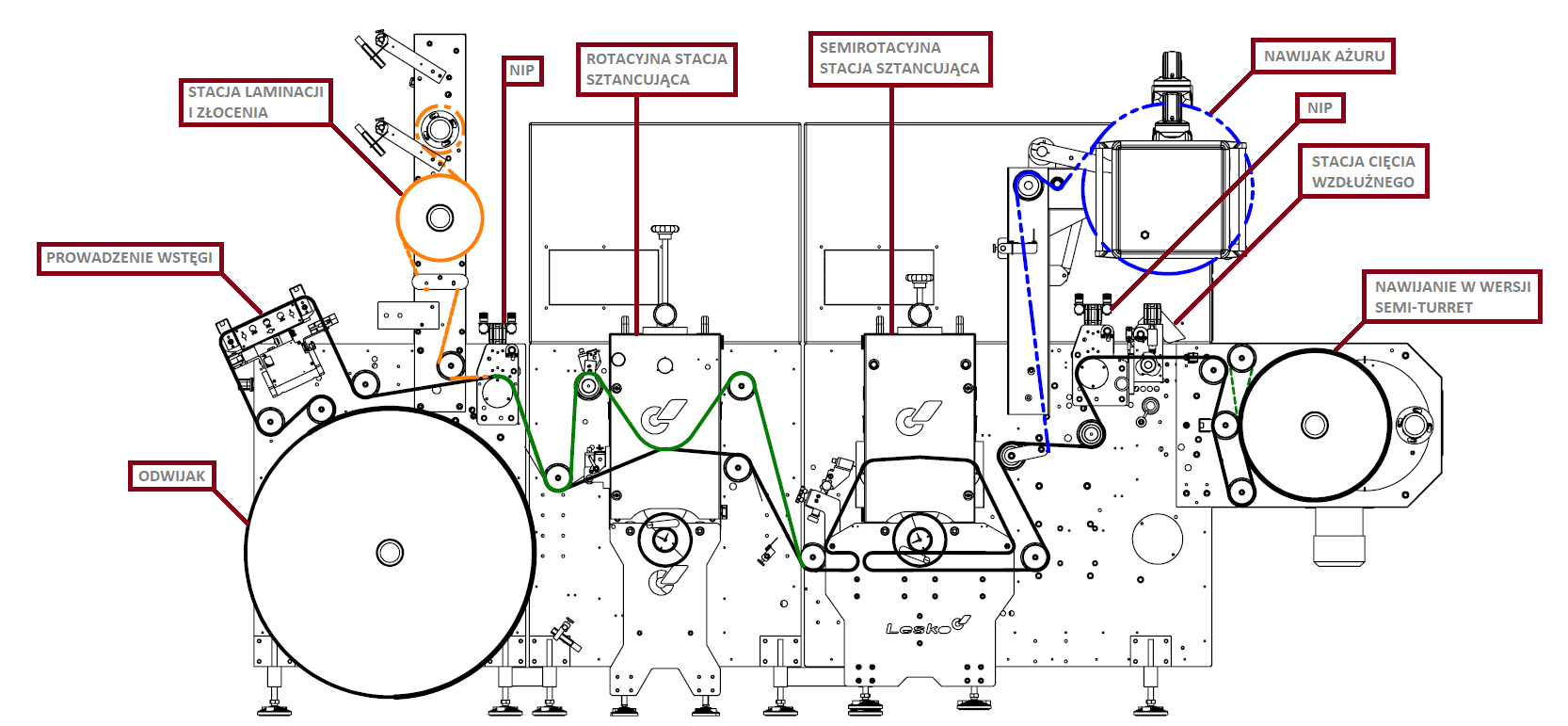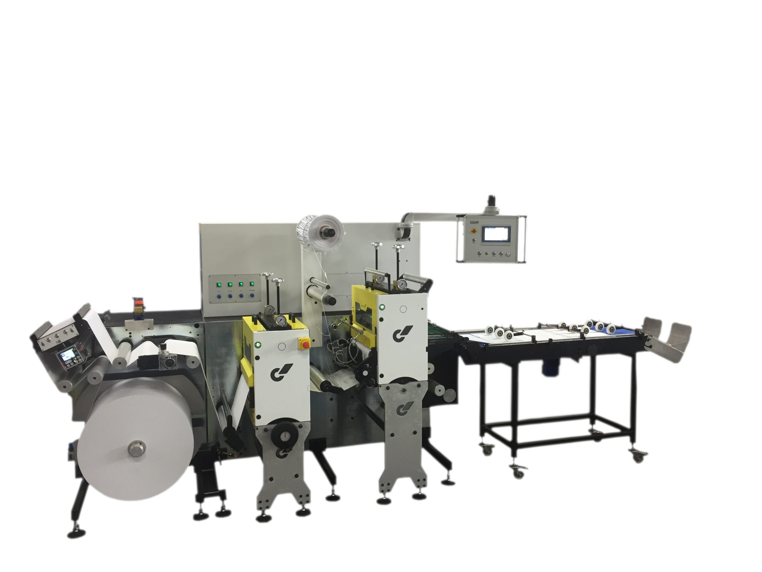 Maszyna CS380 wyposażona jest w zespół laminacji i złocenia, rotacyjną stację wykrojnikową, drugą semirotacyjną stację wykrojnikową. Dzięki temu możliwe jest tworzenie perforacji oraz zdejmowanie ażuru. Maszyna posiada również moduł Semi-Turret’a, co umożliwia efektywną konfekcję wyprodukowanych etykiet.